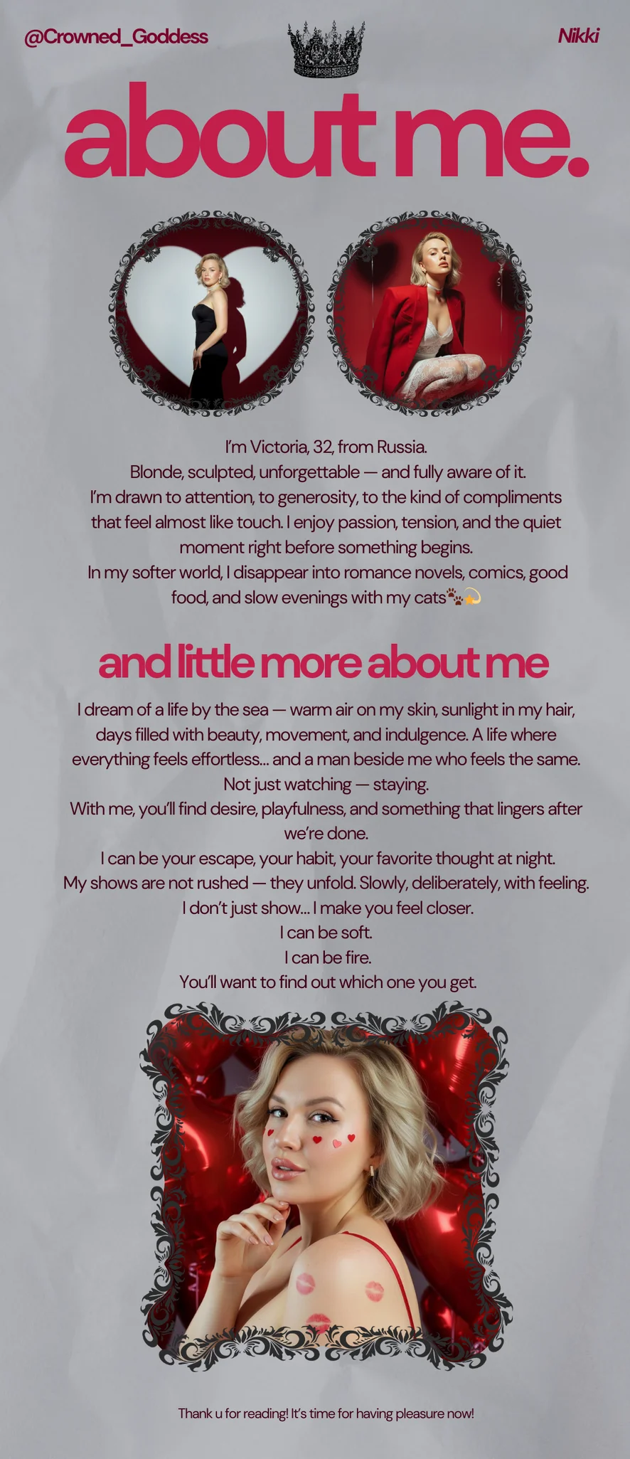 About me Hello everyone! My name is Nikki, I am 32 years old I will be glad to meet you and spend nice time I am here to reveal maximum of my sexuality and femininity 🍑 In my show, we can better know each other and make your hottest fantasies. Don't forget to join~